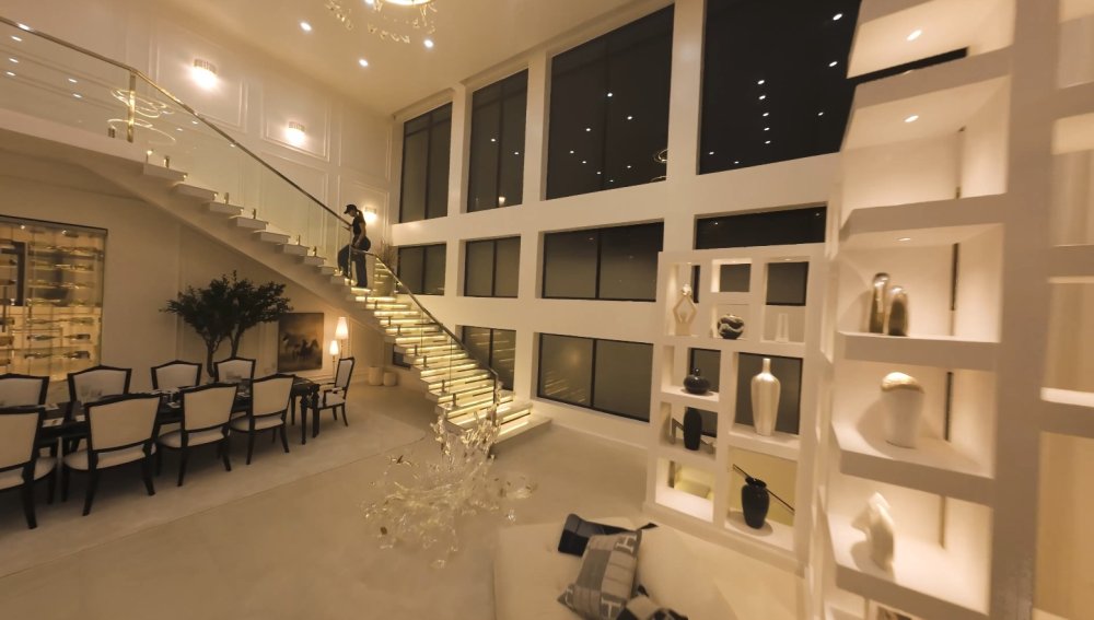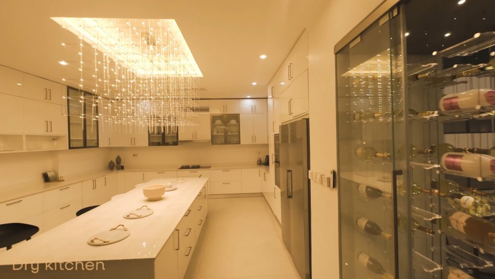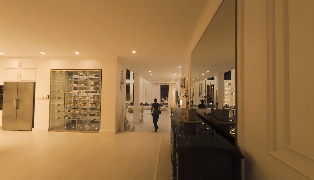 Ukinjira muri iyi nzu, usanganirwa n’uruganiriro rufunguye kandi rwisanzuye, rurimo firigo nini ndetse n’ububiko bw’amacupa y’ibyo kunywa bihenze. Uru ruganiriro ruri hafi y’aho gusangirira ndetse n’igikoni cya kijyambere cyubatse mu buryo bufasha koroshya imirimo yo mu rugo.