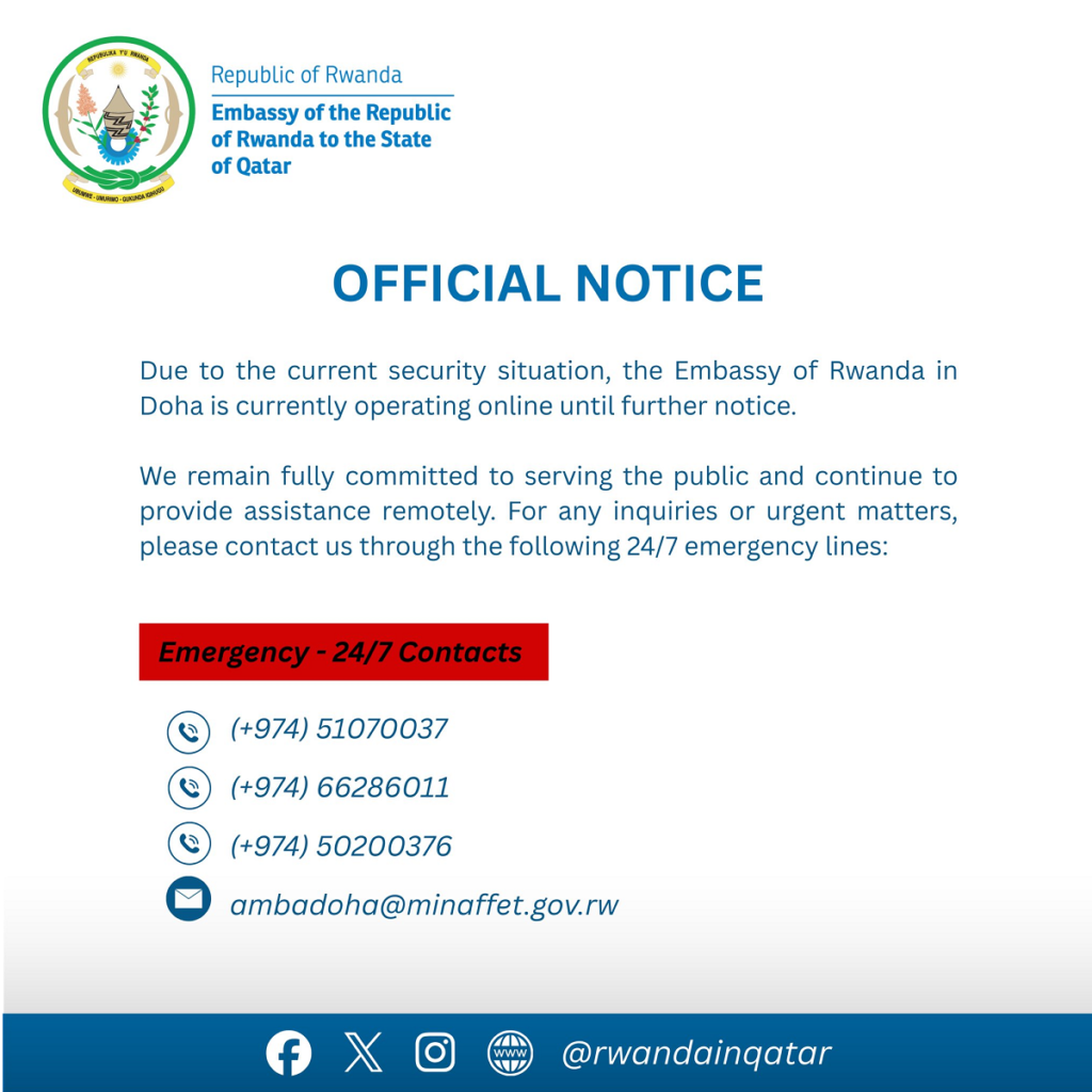 Mu itangazo yashyize ahagaragara, iyi ambasade yavuze ko “kubera uko ibibazo by’umutekano byifashe muri iyi minsi, Ambasade y’u Rwanda i Doha iri gukora mu buryo bw’ikoranabuhanga (online).” Yongeyeho ko nubwo ibikorwa byimuriwe ku ikoranabuhanga, izakomeza gufasha Abanyarwanda bose bayigana.